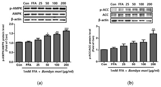 Effects of Bombyx mori (SW) on the expression of AMPK and ACC signaling in FFA-treated HepG2 cells. The expression of p-AMPK/AMPK (a) and p-ACC/ACC (b) were quantified by Western blot analysis. AMPK and ACC were used as a protein loading control of phosphorylated AMPK (p-AMPK) and phosphorylated ACC (p-ACC), respectively. The results from three independent experiments are expressed as the means ± SE. * p < 0.05, ** p < 0.01, and *** p < 0.001 vs. FFA.
