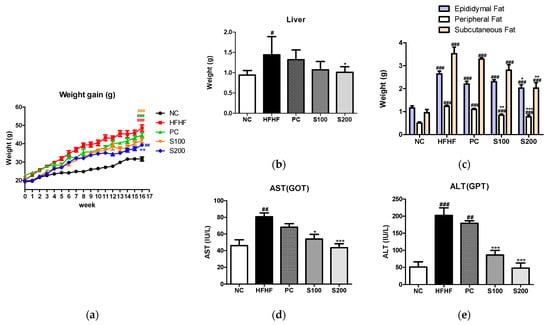 After the animal experiment, changes in body weight and liver and white adipose tissue weights of the mice were recorded (Figure 4). Upon feeding of an HFHF diet for 16 weeks, the body weights of the HFHF group were significantly increased relative to the control group. However, the S100 (100 mg/kg/day, SW) and S200 (200 mg/kg/day, SW) groups showed reduced weights compared to the HFHF group (Figure 4a). The liver and white adipose tissue weights of mice are presented in Figure 4b,c, respectively. The liver and white adipose tissue weights of the HFHF group were increased relative to the NC group. Meanwhile, the weights of the liver and white adipose tissues of SW-supplemented groups were lower than those of the HFHF group. Serum AST and ALT levels were significantly higher in the HFHF group (Figure 4d,e). Treatment with SW significantly suppressed this increase in the S100 and S200 groups. These results indicate that oral administration of SW reduced the gain of body weight and organ weights and significantly improved liver function.