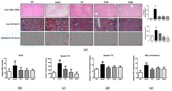 Hepatic biochemical parameters were measured to identify the preventive effect of SW on hepatic fat accumulation. As shown in Figure 5b–e, the HFHF group showed a significant increase in MDA, hepatic TG, TC, and HDL-cholesterol levels compared to the NC group. The MDA level, which indicates lipid peroxidation, was elevated in the HFHF group relative to the NC group. Compared with the HFHF group, the PC, S100, and S200 groups had significantly reduced MDA, hepatic TG, TC, and HDL- cholesterol levels.