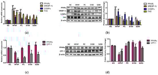 As shown in Figure 6, the mRNA levels of PPARγ, C/EBPα, SREBP-1c, and FAS and the corresponding protein levels were significantly higher in the HFHF group than in the NC group. However, the expression of PPARγ, C/EBPα, SREBP-1c, and FAS was significantly reduced with SW supplementation (Figure 6a,b). Additionally, the mRNA and immunoblots of PPARα and CPT-1 were decreased in the HFHF group relative to the NC group (Figure 6c,d). Compared to the HFHF group, the protein levels of PPARα and CPT-1 were significantly elevated in response to SW supplementation (Figure 6d).
