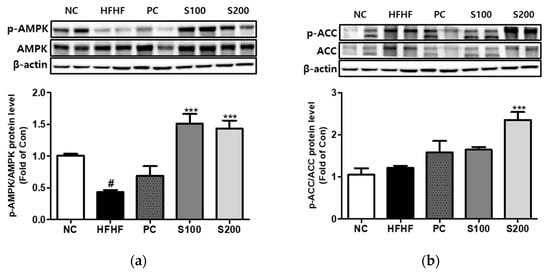 Effects of Bombyx mori (SW) on the expression of AMPK and ACC signaling in HFHF-fed mice. The expression of p-AMPK/AMPK (a) and p-ACC/ACC (b) were quantified by Western blot analysis. AMPK and ACC were used as a protein loading control of phosphorylated AMPK (p-AMPK) and phosphorylated ACC (p-ACC), respectively. β-actin was used as a protein loading control. NC, normal control; HFHF, 45% high fat diet with 10% fructose in the drinking water; PC, positive control (HFHF diet with 1% silymarin); S100, HFHF diet with SW (100 mg/kg/day); S200, HFHF diet with SW (200 mg/kg/day). The results from three independent experiments are expressed as the means ± SE. # p < 0.05 vs. NC; *** p < 0.001 vs. HFHF.