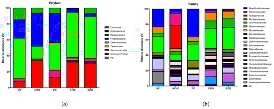 Effects of Bombyx mori (SW) treatment on the fecal microbial diversity in HFHF-fed mice. (a) Relative abundances of the gut microbiota at phylum level and (b) family level. NC, normal control; HFHF, 45% high fat diet with 10% fructose in the drinking water; PC, positive control (HFHF diet with 1% silymarin S100); S100, HFHF diet with SW (100 mg/kg/day); S200, HFHF diet with SW (200 mg/kg/day).
