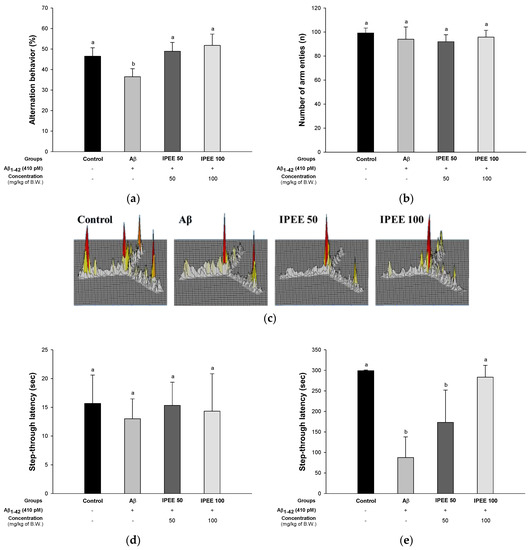 The Y-maze test is a method to evaluate the spatial cognitive function and the networks between the hippocampus, prefrontal cortex, basal forebrain and cerebellum, primarily using the rodent’s instinct to explore new environments [25]. To evaluate the protective effect of IPEE on Aβ-induced memory and learning impairment, behavior tests were performed (Figure 1). A Y-maze test was conducted to measure the working memory using the habits of rodents exploring a new pathway. The results of the Y-maze test are presented in Figure 1A–C. The alternation behaviors of the IPEE groups (48.91% ± 4.30% and 51.78% ± 78%) increased more than the Aβ group (36.47% ± 3.91%) (Figure 1A). The results of number of arm entries were not significant (Figure 1B). Additionally, it was confirmed that the behavior of the Aβ group was irregular compared to the control group in the result of moving accumulation (Figure 1C). Additionally, as the treatment concentration of IPEE increased, the working memory was significantly improved by reducing the irregular movements.