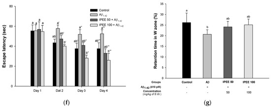Protective effect of immature persimmon (Diospyros kaki) ethanolic extract (IPEE) on Y-maze, passive avoidance and Morris water maze tests in Aβ-induced mice. (a) Spontaneous alternation behavior in the Y-maze, (b) number of arm entries in the Y-maze, (c) tracing path in the Y-maze, (d) passive avoidance on the first day, (e) test trial on the second day in the passive avoidance test, (f) escape latency in the training trial in the Morris water maze test and (g) retention time in the W zone of the probe trial in the Morris water maze test. Results shown are the mean ± SD (n = 7). Data shown were statistically considered at p < 0.05, and different small letters in the graph represent statistical differences.