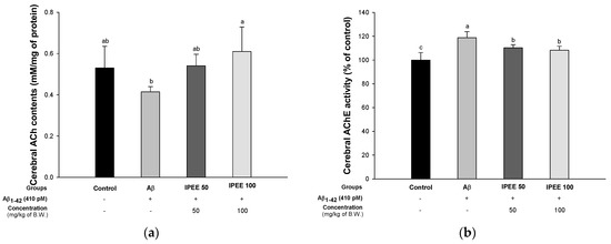 Protective effect of IPEE on Aβ-induced cholinergic dysfunction in mice cerebral tissue. (a) ACh contents and (b) AChE activity. Results shown are the mean ± SD (n = 7). Data shown were statistically considered at p < 0.05, and different small letters in the graph represent statistical differences.