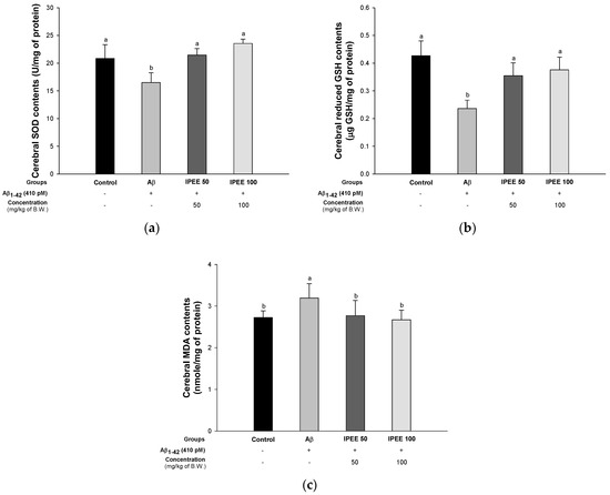 Protective effect of IPEE on Aβ-induced biochemical changes related with the antioxidant system in mice cerebral tissue. (a) SOD contents, (b) reduced GSH contents and (c) MDA contents in mice brain tissues. Results shown are the mean ± SD (n = 7). Data shown were statistically considered at p < 0.05, and different small letters in the graph represent statistical differences.