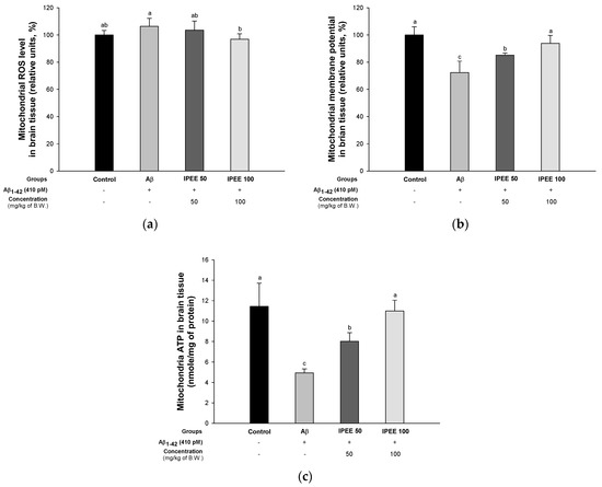 Protective effect of IPEE on Aβ-induced mitochondrial dysfunction in mitochondria from mice cerebral tissue. (a) ROS levels, (b) mitochondrial membrane potential levels and (c) ATP contents of the mitochondria in mice brain tissues. Results shown are the mean ± SD (n = 5). Data shown were statistically considered at p < 0.05, and different small letters in the graph represent statistical differences.