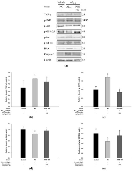 Protective effect of IPEE on the tau pathway in mice cerebral tissue. (a) Representative Western blots for the total protein and expression of TNF-α, p-JNK, p-Akt, p-GSK3β, p-tau, p-NF-κB and β-actin. Protein expression levels of TNF-α (b), p-JNK (c), p-Akt (d), p-GSK3β (e), p-tau (f), p-NF-κB (g), BAX (h) and cleaved caspase 3 (i) normalized to β-actin. Results shown are the mean ± SD (n = 3). Data shown were statistically considered at p < 0.05, and different small letters in the graph represent statistical differences.