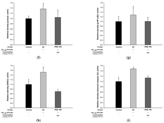 To evaluate the regulatory effect of IPEE via the tau pathway, the protein expressions of TNF-α, p-JNK, p-Akt, p-GSK3β, p-tau and p-NF-κB were measured (Figure 5). The expression of TNF-α (147.66% ± 18.29%) and p-JNK (172.17% ± 17.17%) in the Aβ group was significantly upregulated compared to the control group (Figure 5B,C). The IPEE 100 group statistically downregulated the TNF-α (130.96% ± 19.52%) and p-JNK (85.10% ± 11.00%) expression levels compared to the Aβ group. The expression of p-Akt (84.99% ± 8.16%) and p-GSK3β (67.78% ± 11.16%) in the Aβ group was significantly reduced compared to the control group (Figure 5D,E). The IPEE 100 group statistically increased the expression level of p-Akt (95.83% ± 6.38%) and p-GSK3β (91.87% ± 16.54%) compared to the Aβ group. The expression of p-tau (136.66% ± 15.49%) and p-NF-κB (128.08% ± 30.01%) in the Aβ group was significantly increased compared to the control group (Figure 5F,G). The expression of BAX (152.05% ± 17.14%) and caspase 3 (147.81% ± 1.60%) in the Aβ group was significantly increased compared to the control group (Figure 5H,I). The IPEE 100 group statistically downregulated the expression of p-tau (104.55% ± 21.00%), p-NF-κB (100.44% ± 11.08%), BAX (69.82% ± 3.03%) and caspase 3 (113.64% ± 1.50%) compared to the Aβ group.