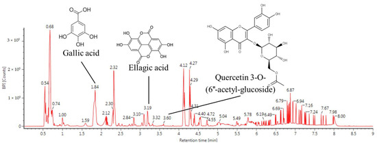 The major physiological compounds of IPEE were qualitatively identified by an ultra-performance liquid chromatography ion mobility separation quadrupole time-of-flight/tandem mass spectrometry (UPLC IMS Q-TOF/MS2) analysis (Table 1 and Figure 6). The MS chromatogram obtained in the negative ion mode was presented as compound 1 (parent ion, 169 m/z; RT, 1.84 min), compound 2 (parent ion, 300 m/z; RT, 3.19 min) and compound 3 (parent ion, 505 m/z; RT, 3.60 min). The compounds identified were gallic acid (compound 1, PubChem CID: 370), ellagic acid (compound 2, PubChem CID: 5281855) and quercetin 3-O-(6″-acetyl-glucoside) (compound 3, PubChem CID: 10006384), respectively.