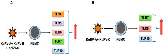 TLR response to infection with multiple KoRV subtypes in koalas (summarized from [77]). When compared with KoRV-A-infected koalas, upregulation was observed in TLR4-TLR7, and TLR10 mRNA in KoRV-A, KoRV-B, and KoRV-C-infected koala peripheral blood mononuclear cells (PBMCs) (A), and TLR7, TLR8, and TLR10 mRNA in KoRV-A and KoRV-C–infected koala PBMCs (B).