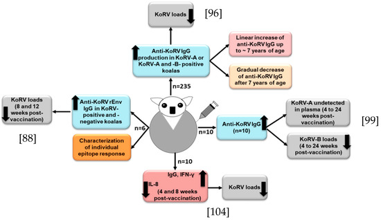 Cartoon shows KoRV vaccine responses in KoRV-infected koalas. In each case [88,96,99,104], anti-KoRV IgGs were developed and viral loads were reduced.