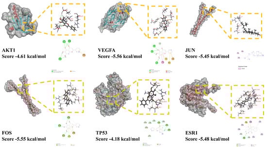 Molecular docking. The figure shows the results of docking with their corresponding effective compounds through the comprehensive ranking of the top 6 proteins, including the three-dimensional conformation of the docking of proteins with effective compounds, the docking score, and the interaction of dimensions.