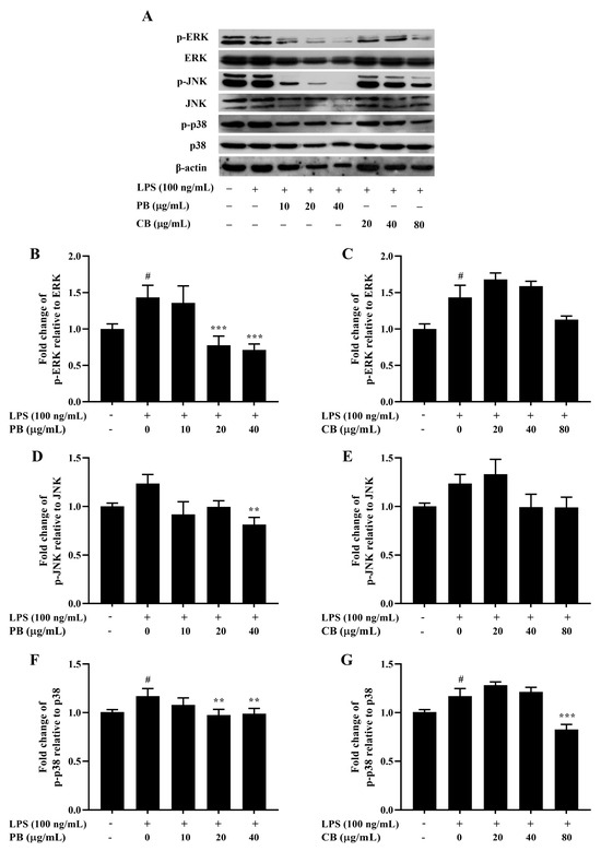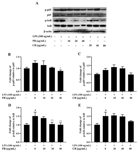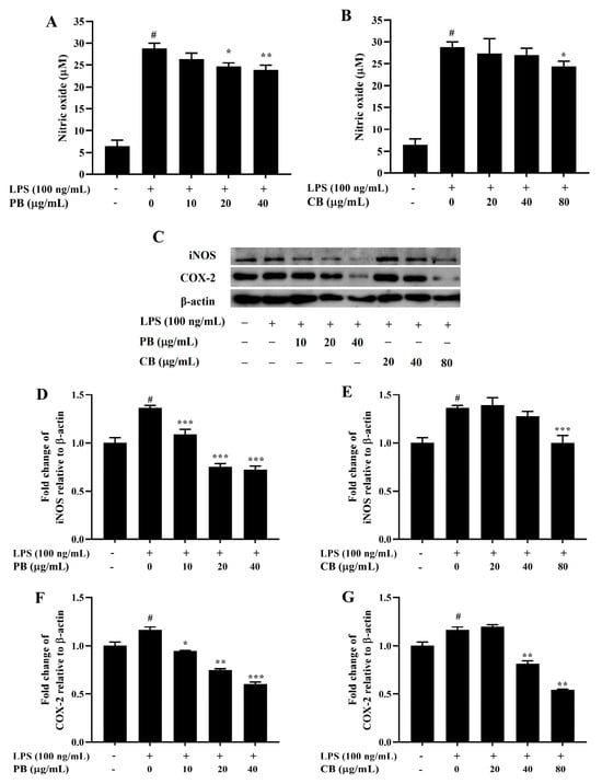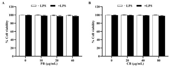 RAW264.7 mouse macrophage cell line was obtained from American Type Culture Collection (ATCC® number TIB-71) and cultured in DMEM supplemented with 10% fetal bovine serum and 100 units/mL penicillin–streptomycin under a humidified (95%) atmosphere of 5% CO2 at 37 °C. Cells from passages 3–7 were used in the experiments. The cells were pre-treated with various concentrations of PB (10, 20, and 40 µg/mL) or CB (20, 40, and 80 µg/mL) for 2 h and then treated with 100 ng/mL LPS. After 24 h treatment, the cell viability and expressions of protein were determined. The levels of NO, IL-6, and TNF-α in culture supernatants were determined.