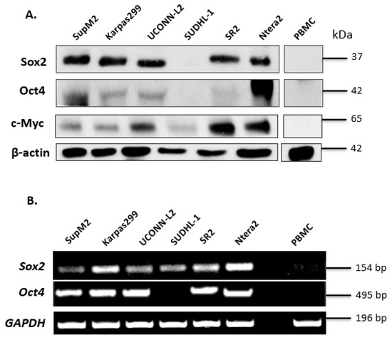 - Gelebart, P.; Hegazy, S.A.; Wang, P.; Bone, K.M.; Anand, M.; Sharon, D.; Hitt, M.; Pearson, J.D.; Ingham, R.J.; Ma, Y.; et al. Aberrant expression and biological significance of Sox2, an embryonic stem cell transcriptional factor, in ALK-positive anaplastic large cell lymphoma. Blood Cancer J. 2012, 2, e82. [Google Scholar] [CrossRef] [PubMed]