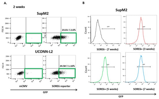 Upon lentiviral transduction of the SORE6 reporter, both SupM2 and UCONN-L2 showed around 20% of SORE6+ cells, detectable by flow cytometry based on their expression of green fluorescent protein (GFP) (Figure 2A). We then purified SORE6− and SORE6+ cells based on their differential GFP expression using a flow-cytometric cell sorter. To ensure that the SORE6 activity in these two cell subsets was stable, we evaluated the GFP expression in the purified SORE6− and SORE6+ derived from SupM2 cells weekly for a total of 7 weeks. As shown in Figure 2B, the GFP expression in SORE6+ cells persisted throughout the 7-week time period and SORE6− cells remained negative for GFP during this time span.