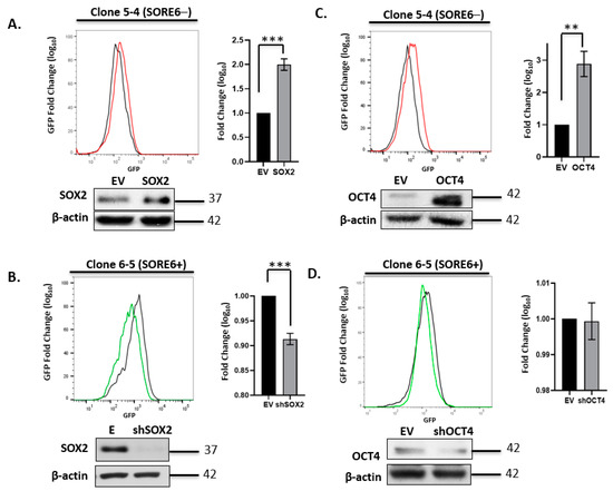 Experimental manipulation of Sox2 and Oct4 in SupM2 SORE6 clones. (A) FACS analysis showing the effect on SORE6 reporter activity of overexpressing Sox2 in single-cell clone 5-4 (SupM2 SORE6−). (B) FACS analysis showing the effect on SORE6 reporter activity of overexpressing shSox2 in single-cell clone 6-5 (SupM2 SORE6+). (C) FACS analysis showing the effect of Oct4 downregulation on SORE6 reporter activity in clone 5-4 (SupM2 SORE6−). (D) FACS analysis showing the effect of shOct4 transfection on SORE6 reporter activity in single-cell clone 6-5 (SupM2 SORE6+). All results shown are representative of three independent experiments and were also repeated in a second batch of single-cell clones. Side panels show the fold change of GFP in log scale (mean ± SEM). Bottom panels of each figure are the Western blots showing the effect of transient transfection with Sox2, Oct4, shSox2, and shOct4 plasmids. Empty vector (EV) was included as a negative control. ** p < 0.01, *** p < 0.001.