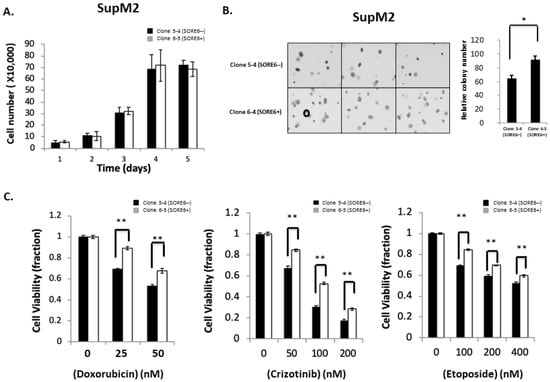 Cell growth, colony formation, and response to therapeutic agents in SORE6− and SORE6+ clones. (A) Cell growth of 5-4 (SupM2 SORE6−) and 6-5 (SupM2 SORE6+) clones over the course of 5 days. (B) Soft agar colony formation of SORE6− and SORE6+ subsets in SupM2 clones for 10 days. The circle on the bottom-left panel marks the cutoff for a colony to be counted. Triplicate experiments were performed. Experiments were repeated in two single-cell clones. The right panel showed the relative colony numbers in SupM2 cells. Results are mean ± SEM, * p < 0.05. (C). SupM2 SORE6− and SORE6+ cells after treatment with doxorubicin, crizotinib, and etoposide at the indicated concentrations for 48 h at 5% FBS. Results shown are representative of three independent experiments. ** p < 0.01.