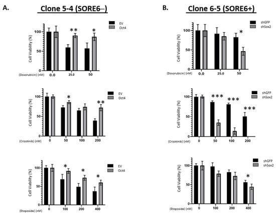 iPS factors enhance chemoresistance of SORE6 clones. (A) Overexpression of EV or Oct4 in 5-4 (SupM2 SORE6−) cells, followed by treatment with doxorubicin, crizotinib, and etoposide. (B) Overexpression of EV or shSox2 in 6-5 (SupM2 SORE6+) cells, followed by treatment with doxorubicin, crizotinib, and etoposide. Results are mean ± SEM, * p < 0.05, ** p < 0.01, *** p < 0.001.