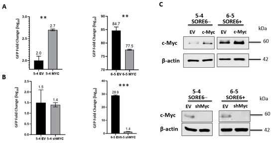 c-Myc regulates the GFP activity of SORE6 clones. (A) FACS analysis of GFP activity following overexpression of c-Myc in 5-4 (SupM2 SORE6− clone) and 6-5 (SupM2 SORE6+ clone). (B) FACS analysis of GFP activity following downregulation of c-Myc in 5-4 (SupM2 SORE6− clone) and 6-5 (SupM2 SORE6+ clone). (C) Western blot indicating successful transfection of c-Myc or shRNA for Myc for both experiments are included in the panels to the right. Results are mean ± SEM, ** p < 0.01, *** p < 0.001. Of note, the c-Myc band for the SORE6− cells treated with shRNA for c-Myc (Figure 7C, bottom-left corner) was intentionally over-exposed to reveal the otherwise weak c-Myc band.