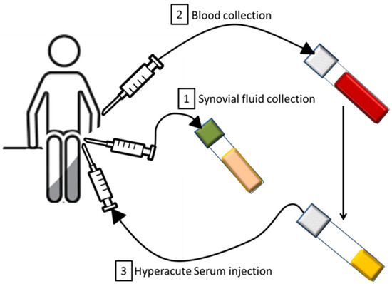 Schematic of the medical procedure. Firstly, when possible, synovial fluid was collected from the patient’s knee. Then, blood was taken and hyperacute serum was obtained from it. Hyperacute serum was finally intraarticularly injected.