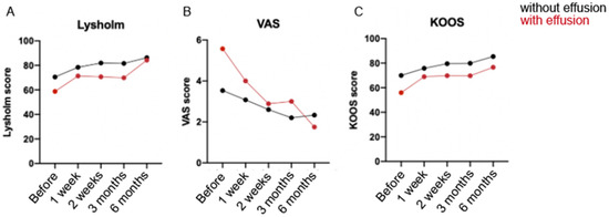 Graphs showing the Lysholm-Tegner (A), VAS (B) and KOOS (C) scores. Clinical data after 6-month follow-up after hyperacute serum treatment in OA knee at different time points: before the treatment, and after it at week 1, week 2, 3 months and 6 months. Red represents the clinical data from patients with effusion in the knees and black, without effusion.