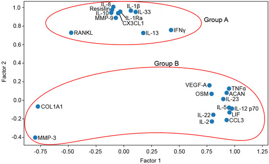 Multivariate Factor Analysis was used to investigate clusters of cytokines that may react similarly to a common factor (Figure 4). Using the data from week 2 and based on Eigenvalue score, 2 main groups, which included 24 out of the total 40 measured cytokines, were identified. The 11 molecules clustered in Group A included the proinflammatory cytokines IL-1β, IL-13 and IL-33, the anti-inflammatory cytokine IL-10; the IL-1 receptor antagonist, IL-1Ra; chemokines such as IL-8 and fractalkine (CX3CL1); the matrix metalloproteinase MMP-9; the peptide hormone resistin; the cytokine IFNγ and the ligand for the RANK receptor (RANKL), involved in bone resorption through osteoclast activation. According to the Multivariate Factor Analysis performed, Group B was more disperse and therefore less homogeneous in terms of similar reaction patterns to hyperacute serum. Group B included the proinflammatory cytokines TNFα, IL-5, IL-2, IL-12p70, IL-22 and IL-23; metalloproteinase MMP-3; chemokine CCL3(MIP1α); the pleotropic cytokines leukemia inhibitory factor (LIF) and oncostatin (OSM); and other proteins that play a role in inflammatory processes and extracellular matrix structural support, such as the vascular endothelial growth factor A (VEGF-A), aggrecan (ACAN) and collagen type I α (COL1A1).