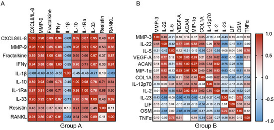 Pearson’s correlation heatmaps of the two identified protein groups after Multivariate Factor Analysis. Cytokines belonging to group A (left panel), presented strong to very strong correlation (p < 0.05), with the exception of resistin (A). Generally, group B (right panel) presented weaker correlations; however, the cluster including VEGF-A, ACAN, CCL3/MIP-1α, IL-22, IL-2, IL-23 and OSM were highly and significantly correlated (p < 0.05) (B). Color code represents positive or negative linear relationship between proteins, red and blue, respectively. White values indicate no shared trend between the proteins.