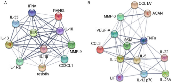 This high correlation suggests that cytokines belonging to the same group or cluster may fluctuate together. To gain a better understanding in known protein–protein interactions of the two groups, further network analysis using the STRING database was performed (Figure 6). STRING analysis showed that connectivity rates were slightly higher for group A (Figure 6A) as it had 47 connections between 11 proteins; and group B (Figure 6B) revealed 47 connections between 13 proteins, resulting in 4.27 and 3.61 of connectivity rate, respectively. Moreover, when looking at the confidence of the data supporting those connections, represented by the thickness of the lines, group A was higher when compared to group B.