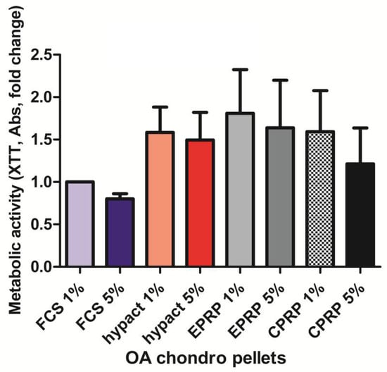 Metabolic activity of OA chondrocytes in 3D pellet culture, n = 5 (CPRP = citrate platelet-rich plasma, EPRP = EDTA platelet-rich plasma, FCS = fetal calf serum, hypACT = hyperacute serum, Results are expressed as the mean ± SD).