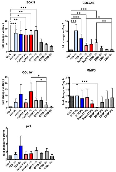 General increase of SOX9 expression was observed in all tested groups after 21 days of culture. However, significant change was reported only versus day 0 in groups supplemented with FCS 1% (p = 0.0007), FCS 5% (p = 0.0046), hypACT 1% (p = 0.0169), hypACT 5% (p = 0.0043) and EPRP 1% (p = 0.0002). Chondrocytes supplemented with EPRP 5%, CPRP 1% and CPRP 5% expressed lower levels of SOX9 which were not significant. Expression of another cartilage biomarker COL2AB was significantly higher versus day 0 in FCS 1% (p < 0.001), FCS 5% (p < 0.001), hypACT 1% (p = 0.004), and EPRP 1% (p < 0.001) groups. A nonsignificant trend was identified in hypACT 5% group (p = 0.09). No increase in COL2AB production was observed in chondrocytes supplemented with CPRP 1% and 5% and it was significantly lower than in groups with FCS 1% (p = 0.01; p < 0.001) and 5% supplementation (p = 0.03; p < 0.001). Additionally, hypACT 1% and EPRP 1% had significantly higher COL2AB level than CPRP 1% (p = 0.01, p = 0.003). COL1A1 which is a hypertrophic differentiation marker [14] was especially upregulated in hypACT 5% group and the observed increase was significant versus CPRP 1% (p = 0.02) as well as in case of EPRP 1% versus CPRP 1% group (p = 0.003). Interestingly, supplementation with 1% EPRP resulted in an extensive drop of MMP3 expression versus day 0 (p < 0.001), whereas the addition of hypACT 5% and EPRP 5% caused only a moderate, not significant decrease vs. day 0. Additionally, a senescent marker p21 was included in the study. The p21 expression was higher only in OA chondrocytes which were treated with 5% FCS but there was no significant difference versus day 0 and it remained stable in all the other groups.