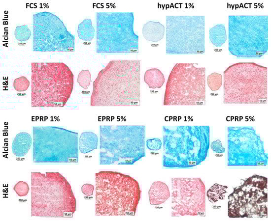 Histological slices derived from pellets supplemented with FCS 5%, hypACT 5% and EPRP 1% show a confined ECM morphology and good tissue quality. Samples from FCS 1%, hypACT 1% and EPRP 5% show a diffuse but homogenous ECM morphology and average tissue quality, however, based on this qualitative assessment the pellets from EPPR 5% group, seem to have slightly more fissures than FCS 1% and hypACT 1%. Cuts from 1% and 5% CPRP groups show a diffuse and heterogenous ECM composition with poor tissue quality. Many fissures, disintegrated tissue islands and platelets clumps can be found especially in pellets supplemented with 5% CPRP.