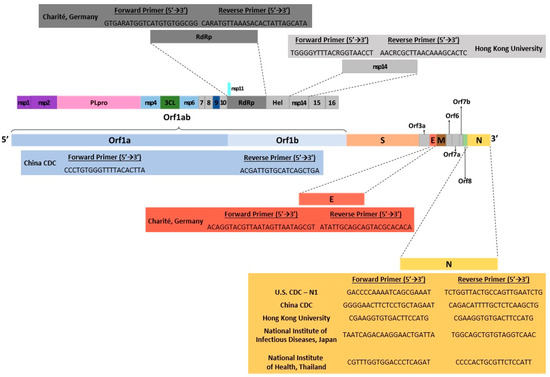 Illustration of SARS-CoV-2 genomic map with gene targets of diagnostic RT-PCR tests and their corresponding 5′→3′ forward/reverse primers. Data were obtained from several published reports [6,19,20,21,22,24].