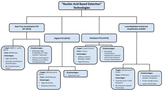 The major limitation of LAMP assays is the difficulty of preparing appropriate primer designs, therefore reducing its reproducibility in multiplexing assays [69]. Additionally, LAMP seems to be less sensitive than PCR when the sample being tested is more complex, such as blood or tissue samples [69]. Up to this point, several LAMP-based assays are validated using computational resources only, without implementing any clinical data for final performance analysis [65]. The nucleic-acid-based detection methods used for SARS-CoV-2 detection are summarized in Figure 3.