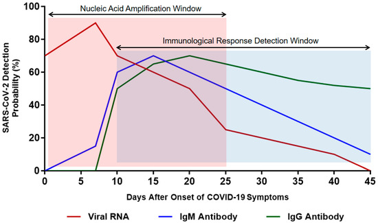 Immunoglobulin M (IgM) is the first line of defense against viral infection prior to the production of a long-term immune response provided by immunoglobulin G (IgG) [75]. Therefore, detecting certain antibodies of SARS-CoV-2 in a blood sample serves as a highly sensitive diagnostic technique [76]. Studies have reported that IgM antibodies can be detected following 3 to 6 days of SARS, whereas IgG antibodies are detected after 8 days of infection (Figure 4) [77]. Since SARS-CoV-2 is a member of the same family of viruses that cause SARS (Coronaviridae), the presence of IgM and IgG antibodies against them is expected in the blood of COVID-19 patients as an indication of infection [76]. IgM detection is considered an indication of early infection, whereas the presence of IgG antibodies indicates a late viral exposure [78].
