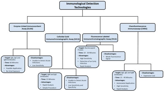 One of the major limitations of FICA is fluorescence quenching, which decreases the emission intensity of a certain fluorophore [97]. This could happen as a result of complex formation, excited state, and energy transfer [97]. Consequently, quenching poses an issue for laser-induced fluorescence in FICA. The immunological detection methods used for SARS-CoV-2 detection are summarized in Figure 5.