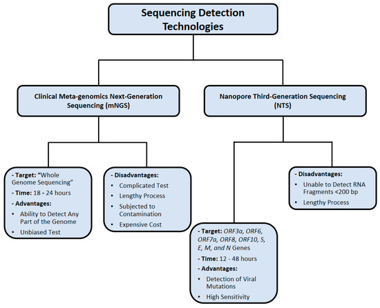 A few challenges of NTS implementation are characterized by the requirement of technical bioinformatics expertise, high cost, and lengthy time [115]. However, Oxford Nanopore Technologies (ONT) is the recently developed technological innovation NTS, which addresses these challenges by providing a user-friendly platform that saves time, but this method is still limited by the issue of base-calling accuracy in comparison with other platforms [115]. Figure 6 summarizes the nucleic acid sequencing methods that were utilized in SARS-CoV-2 detection.