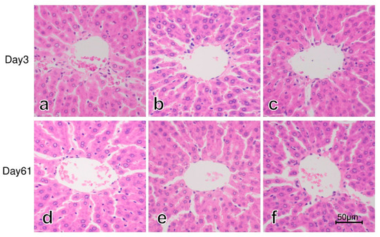 Liver of rats on day 3 (a–c) and day 61 (d–f) after the exposure to 56MnO2 particles or 60Co-γ rays. No significant histological changes were noted in Mn56x3 (a,d), Co60 (b,e), and the control (d,f) groups. HE staining, original magnification 400×. A bar indicates 50 µm.