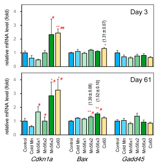 Figure 2 shows the expression levels of Cdkn1a, Bax, and Gadd45 genes. On day 3 postexposure, Cdkn1a mRNA levels were significantly increased in both Mn56x3 and Co60 groups over the cold Mn group, while the increase was significant only in the Co60 group in comparison with the control group. The Bax expression was elevated by 29% in the Co60 group on day 3 postexposure, while it increased in Mn56x2 and Mn56x3 groups on day 61. There were no significant changes in Gadd45 expressions among groups.