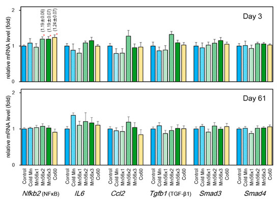 Relative mRNA expression levels of Nfkb1, Il6, Ccl2, Tgfb1, Smad3, and Smad4 genes in the liver of rats on day 3 (top) and day 61 (bottom) after the exposure. Control (solid blue): untreated group; Cold Mn (diagonal blue stripes): exposed to stable MnO2 particles; Mn56x1 (green stripes), Mn56x2 (diagonal green stripes), and Mn56x3 (solid green): exposed to 56MnO2 particles at the activity of 2.6 × 108, 5.5 × 108, and 8 × 108 Bq, respectively; Co60 (solid yellow): exposed to 60Co γ-rays (2 Gy) * p < 0.05 vs. control.