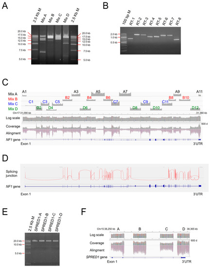 Combined long amplicon sequencing (CoLAS) for NF1 diagnosis. (A) The 0.4% agarose gel electrophoresis of NF1 multiplex long-range PCR products. (B) The 1.0% agarose gel electrophoresis of NF1 RT-PCR products. (C) Integrative Genomic Viewer (IGV) bam coverage of NF1 multiplex long amplicon sequencing (MuLAS). Library preparations were done each A–D multiplex mix amplicon (upper panel) and all pooled amplicons (lower panel). Dashed line in the coverage track indicates a 600 depth. (D) Sashimi plot of NF1 reverse-transcribed long amplicon sequencing (rLAS). (E) The 0.5% agarose gel electrophoresis of SPRED1 long-range PCR products. (F) IGV bam coverage of SPRED1 very long amplicon sequencing (vLAS).
