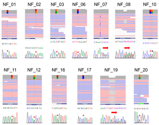 NGS (IGV) and Sanger validation of the detected NF1 mutations. Single-base substitutions are indicated by stars, and frameshifts are indicated by arrows. Note, in NF_10, NGS, but not Sanger sequencing, shows the mutation, and SNP are located on a different allele. In NF_17, both NGS and Sanger show an unbalanced mutation allele frequency, indicating a mosaic mutation.
