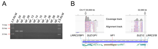 Detection of the type-1 microdeletion of NF1. (A) The 0.5% agarose gel electrophoresis of type-1 microdeletion-specific long PCR. (B) NGS mapping of the PCR amplicon of NF_04. This PCR product was mapped separately at a distance of 1420 Kb containing NF1 (31,090 kb–31,380 kb) as the expected loci described in the text. On the alignment track, pink and purple colours indicate the direction of the read strands, and white indicates the reads mapped to multiple regions due to pseudogenes.