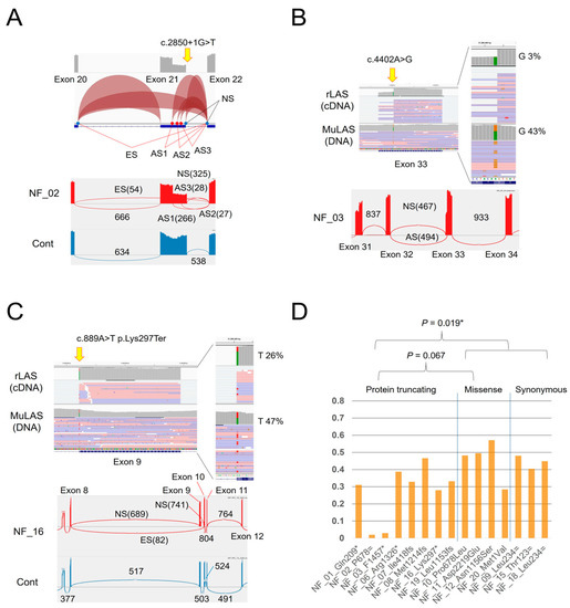 Moreover, the mutant allele expression ratio was compared to the wild-type allele at the mRNA level (corrected by the allele ratio at the DNA level) between the protein truncating mutations (frameshift, nonsense, and splicing mutations) and missense mutations. For NF_02, the polymorphism detected in this sample, NM_000267.3:c.8151G>A p.Pro2717=, was used because the mutant base was spliced out and was not included in the mRNA. NF_03 was classified as a protein-truncating mutation based on the above discussion. NF_17 was excluded due to a mosaic mutation. Protein-truncating mutations had the impression that a lower allele expression level than that of the missense mutations and a significant difference was observed (p-value = 0.019) when the synonymous polymorphism of the sample for which no mutation was identified was added (Figure 4D). It is suggested that protein-truncating mRNA may be destroyed by nonsense-mediated mRNA decay (NMD). However, this difference of mRNA expression is largely due to the two samples of NF_02 and NF_03, and it should be noted that there are some exceptional samples, such as NF_08, that have a hardly decreased mRNA level despite the frameshift mutation in exon 27. It suggests the sure existence of a NMD evasion case that does not follow the canonical rules. Additionally, NF_20 is a start codon mutation, NM_000267.3:c.1A>G p.Met1Val, being classified as missense mutation, but the mRNA level of the mutant allele may be decreased. However, no splicing abnormalities were observed in rLAS.