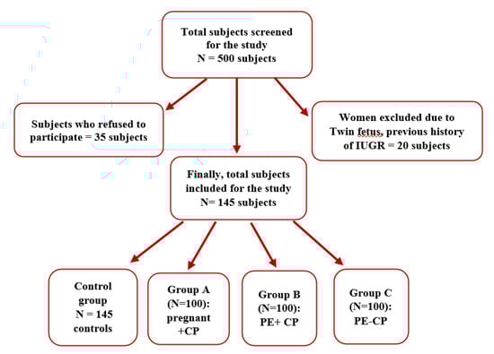 Five hundred pregnant women aged 18–35 years from Obstetrics and Gynaecology Department, Narayana Medical Hospital, Nellore, Andhra Pradesh, India were screened during the period August 2015 to August 2018. Of these, 35 individuals refused to participate in the study, and 20 were excluded due to twin fetuses, previous history of intrauterine growth restriction (IUGR), and uterine infections. Finally, 445 pregnant women were recruited and were categorized into four groups based on inclusion and exclusion criteria. Controls–145 healthy (systemic + periodontal) pregnant women, Group A–100 Systemically healthy pregnant women with chronic periodontitis (CP), Group B–100 Preeclamptic pregnant women with chronic periodontitis (PE + CP), Group C–100 Preeclamptic pregnant women without chronic periodontitis (PE) (Figure 1). The power of the study was calculated to be 95%. The systemic health status of the participants was obtained from previous medical records. The diagnosis of pre-eclampsia was given by a certified.
