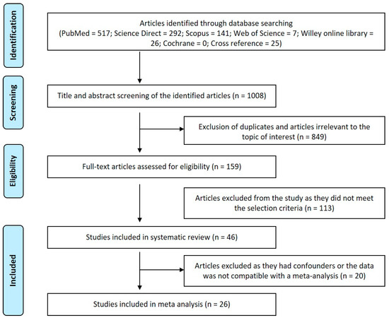 Pubmed search yielded 517 papers; Science direct search yielded 292 papers; Scopus search yielded 141 papers; Web of Science yielded seven papers; Willey online library yielded 26 papers, and Cross-reference search yielded 25 papers. After search refinement, 849 articles were excluded due to unmatched titles and abstracts, including four duplicated data reports and one animal study. After extraction of these articles, 159 articles had their titles relevant to the present work. Full-text was retrieved for the screened articles. Articles with un-matched objectives (n = 84), systematic reviews (n = 1), critical reviews (n = 2), reviews (n = 25) and letter to the editor (n = 1) were excluded. Forty-six articles with matched objectives were included in the systematic review. Only 26 articles had data compatible for a meta-analysis (Figure 1).