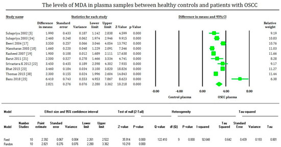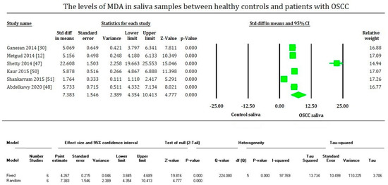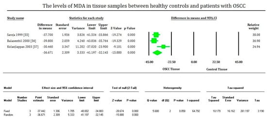 The Forest plot was derived using the mean difference, and standard mean difference method to carry out a meta-analysis using comprehensive meta-analysis software version 3 (Biostat Inc. Englewood, NJ, USA). The overall mean difference or standardized mean difference value of MDA in OSCC was analyzed at a 95% confidence interval (CI). A random-effects model was used in the analysis due to the presence of significant heterogeneity. The articles, which expressed the MDA levels in similar units in each sample, only were included in the meta-analysis.