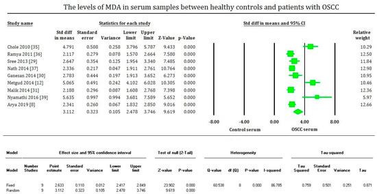 Forest plot shows mean difference estimates with 95% confidence intervals representing differences in serum levels of MDA between oral squamous cell carcinoma group and healthy controls.