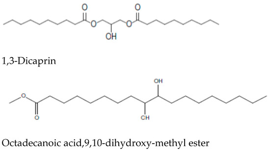 | 15 | 15.688 | 4.8 | Decanoic acid, 2-hydroxy-1-(hydroxymethyl)ethyl ester | C13H26O4 |