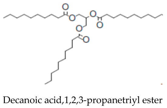 | 12 | 15.088 | 9.4 | Decanoic acid,1,2,3-propanetriyl ester | C33H62O6 |